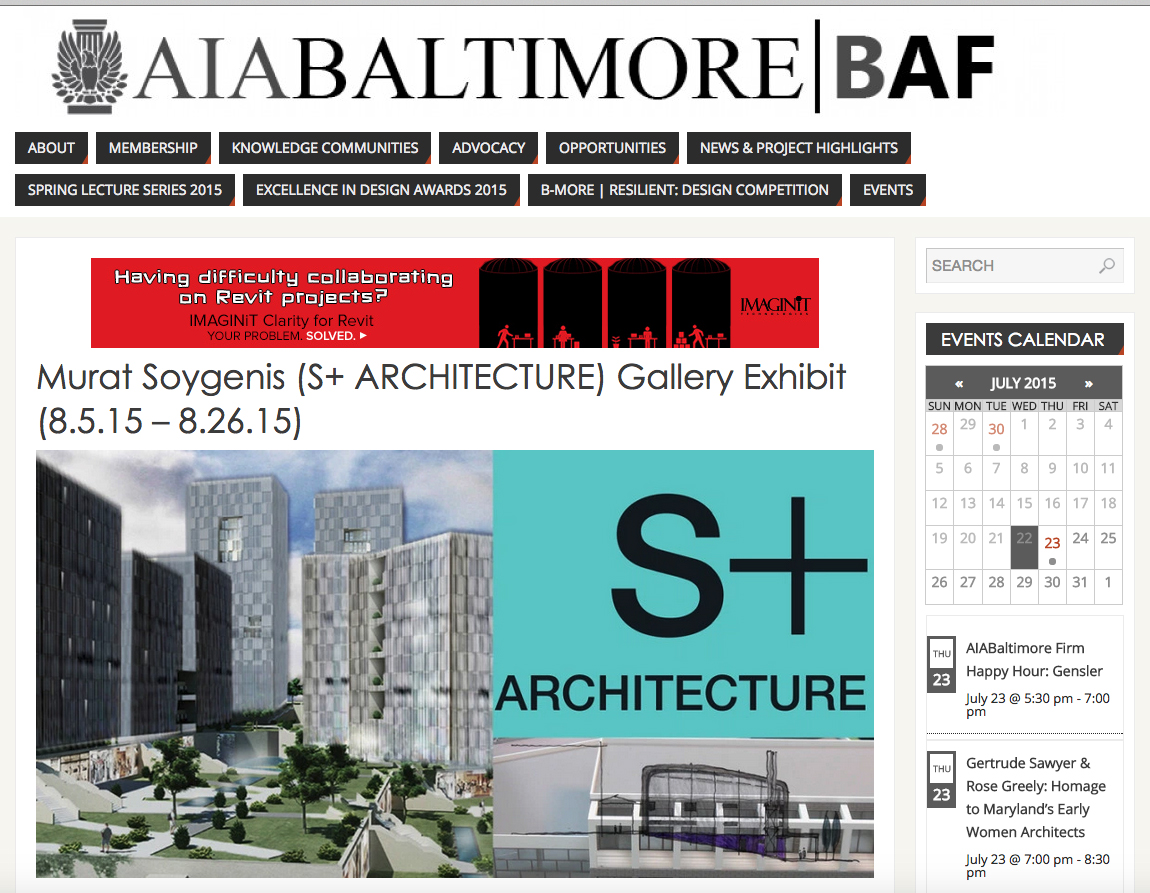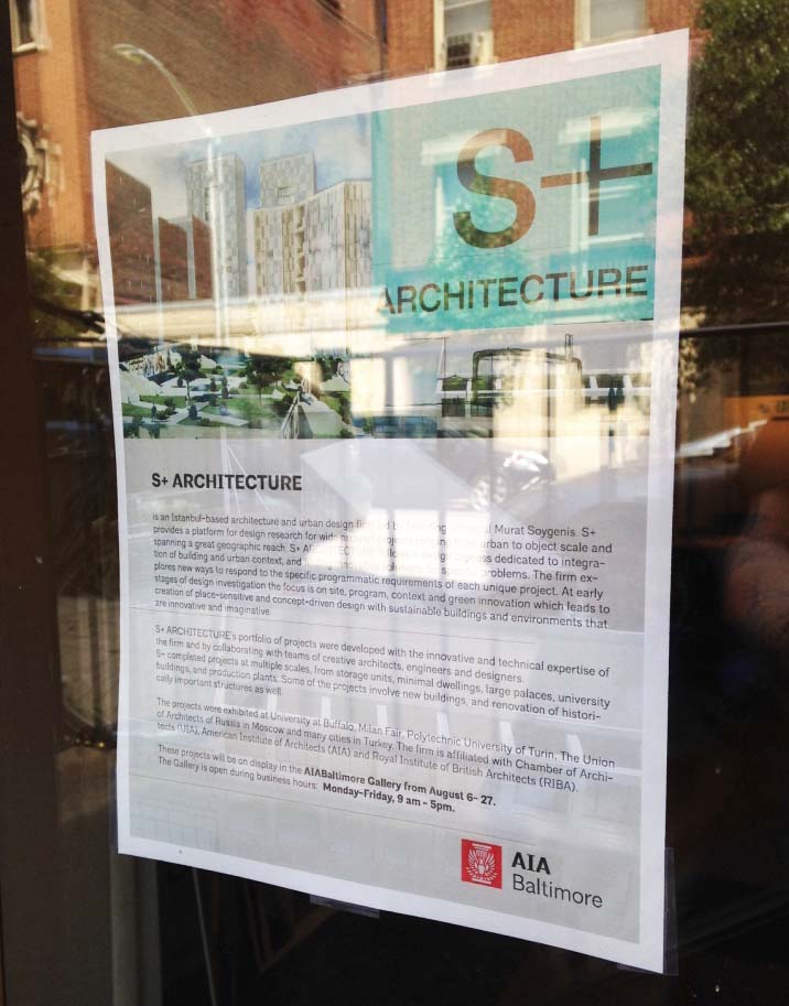 S+ ARCHITECTURE’ın son 10 yıldan mimari projeler ağırlıklı sergisi 05-26 Ağustos 2015 tarihleri arasında AIA Baltimore Gallery’de görülebilir. AIA Baltimore birimi, Amerikan Mimarlar Enstitüsü’nün 1871’de kurulmuş olan en eski üçüncü birimi olup, bünyesindeki galeride düzenli olarak mimarlık sergilerine evsahipliği yapmakta ve yaşanabilir bir dünya için liderlik rolü üstlenmektedir.