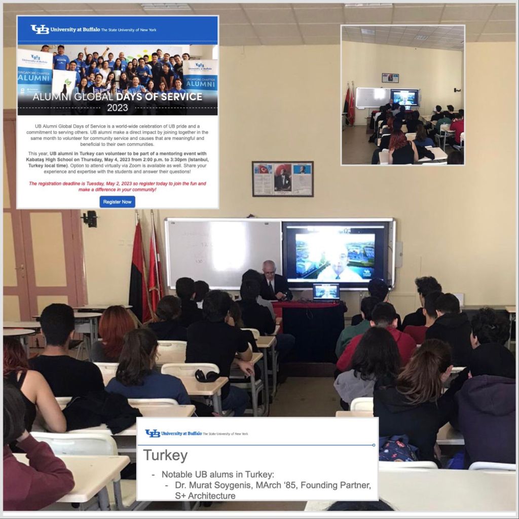 Buffalo Üniversitesi Mezunları Türkiye Birimi’nin Kabataş Erkek Lisesi ile birlikte ‘UB Global Days of Service’ kapsamında düzenlediği mentorluk etkinliğinde meslek seçim aşamasında olan öğrencilere Prof. Dr. Murat Soygeniş tarafından mimari formasyon ve deneyim kulvarları bilgileri aktarıldı. / During the mentoring activity organized by University at Buffalo Turkey Network and Kabataş High School for ‘UB Global Days of Service’, Professor Murat Soygeniş shared architectural formation and experience paths with the students.